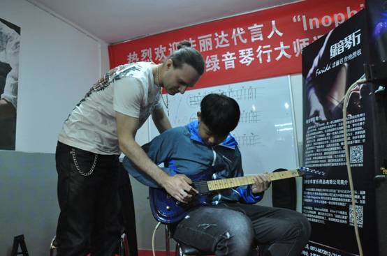 在课堂的提问环节,琴行老师向Inophis提出了各种音阶以及技巧问题,Inophis也耐心地作出了解答。因为有了Fishman的赞助,他们的工作人员不仅拿起法丽达R-10S CE与Inophis合奏,还为现场增添了有奖问答环节和音箱演示环节,让大师课的内容更为丰富。