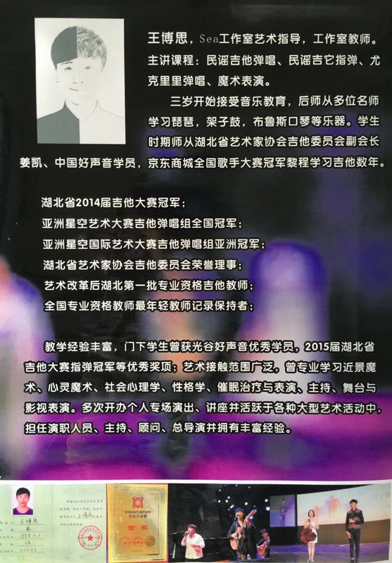 2016年,18岁,与好友于湖北武汉共同成立Sea艺术工作室,发展艺术教育,艺术传播。任工作室负责人及艺术指导。