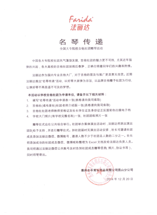 欢迎各高校社团与负责法丽达校园推广业务的苏先生联系,QQ号:1500240147.法丽达吉他再次声明:所赠送的吉他均为社团公共财产。具体活动办法如下:
